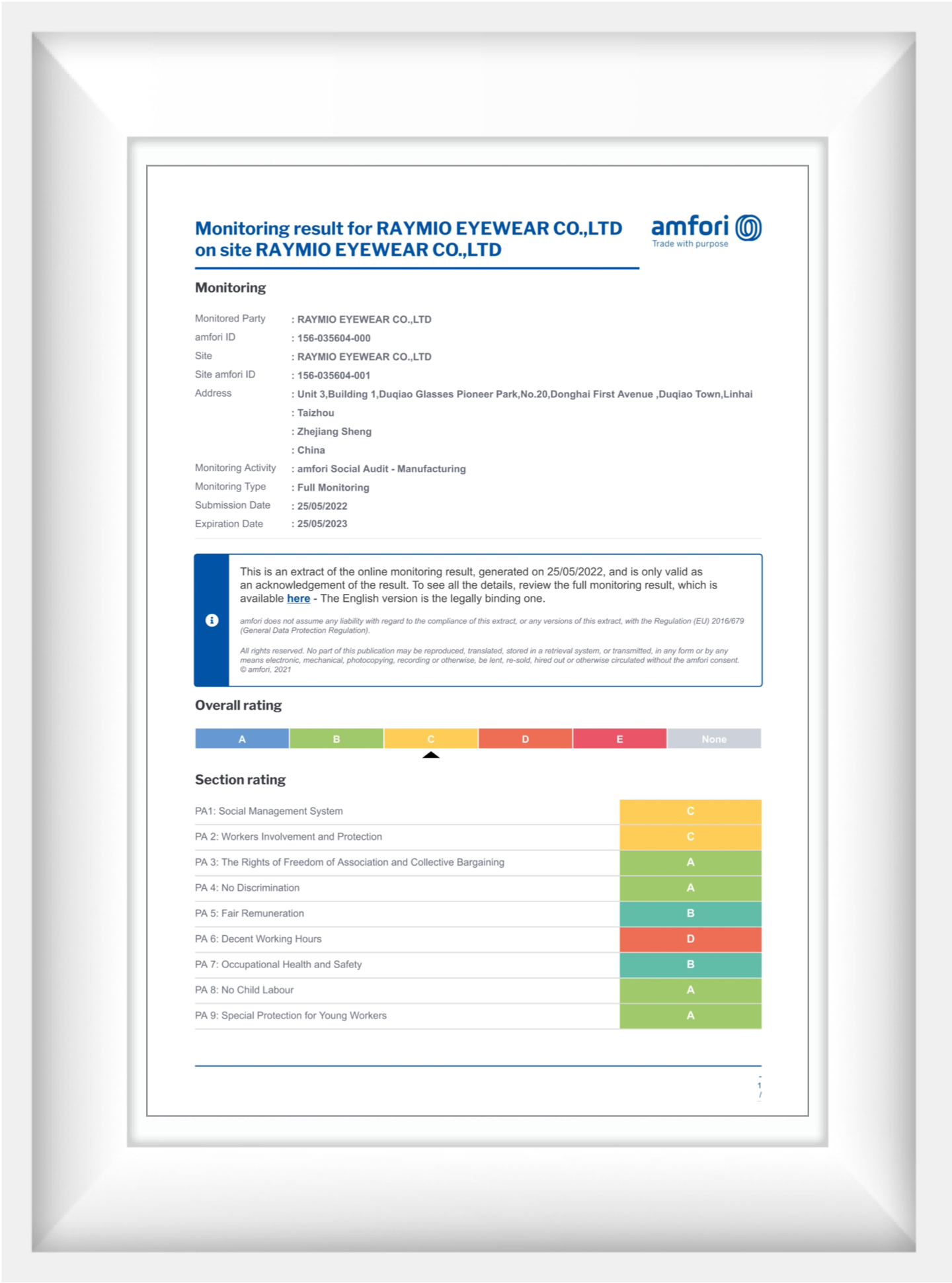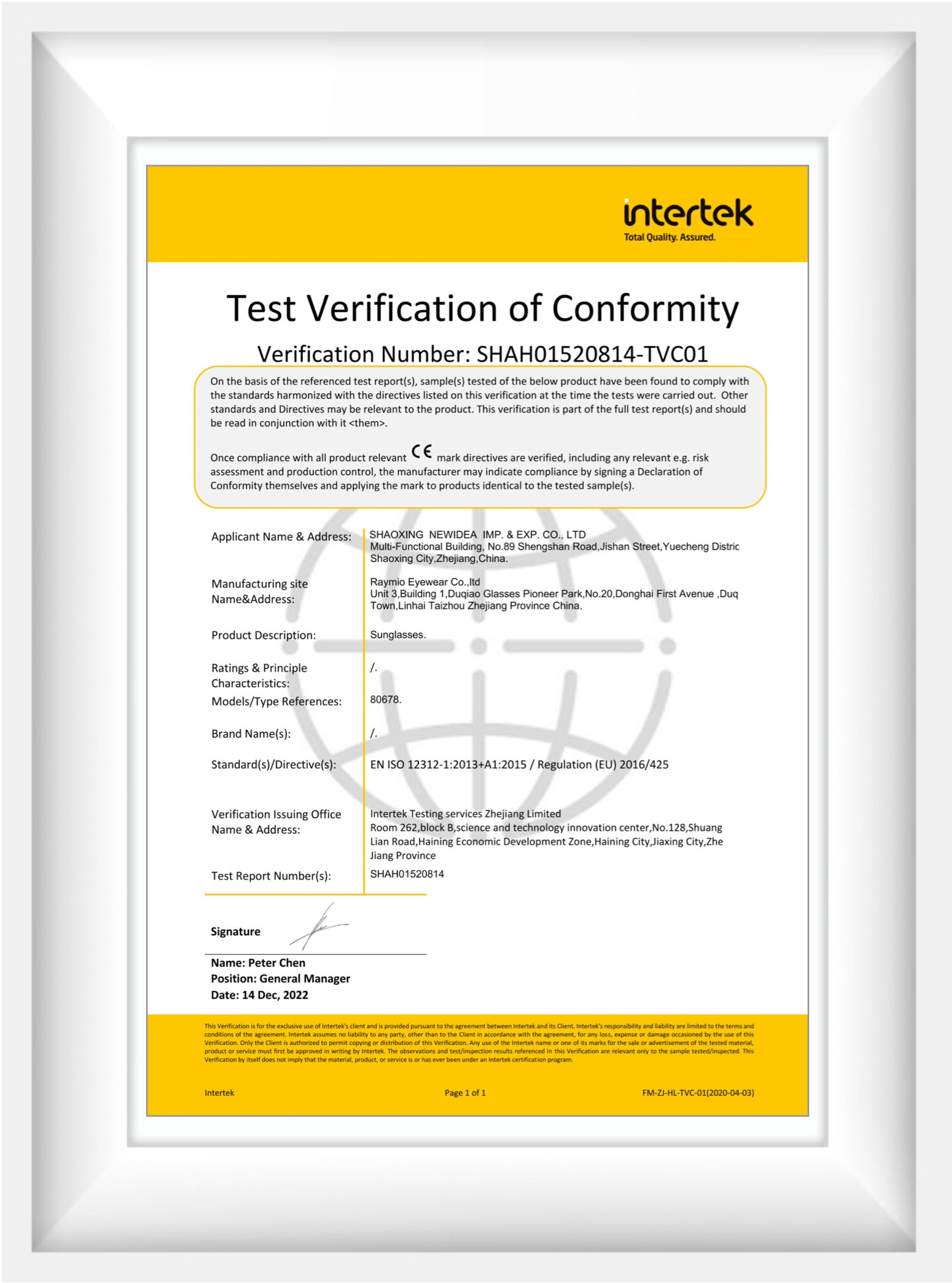 Raymio ມີປະສົບການດ້ານອຸດສາຫະກໍາແວ່ນຕາຫຼາຍກວ່າ 10 ປີ. ພວກເຮົາມີໃບຢັ້ງຢືນເຕັກໂນໂລຢີສິດທິບັດແຫ່ງຊາດ, ຜ່ານການຢັ້ງຢືນຄຸນນະພາບ ISO9001, ການກວດສອບ BSCI, CE, FDA, ANSI, AS / NZS ໃບຢັ້ງຢືນ. ຜະລິດຕະພັນຂອງພວກເຮົາຂາຍດີໃນບ້ານແລະຕ່າງປະເທດ, ໂດຍສະເພາະອາເມລິກາເຫນືອແລະເອີຣົບ.